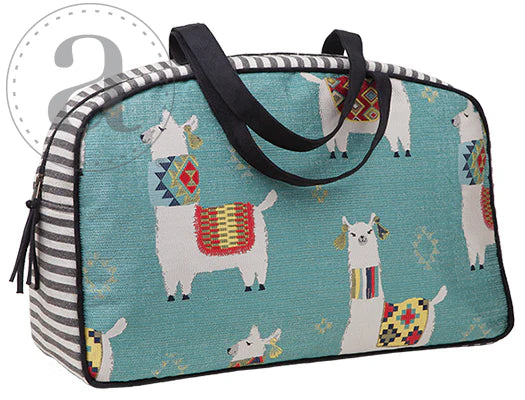 Fun and trendy llamas woven into a jacquard. Perfect for a weekend away, a knitter's project bag, an airline carry-on or a diaper bag. Designed for function and style, this Weekender features two sturdy shoulder straps, a full 28” zipper closure, and protective feet. Inside, you’ll find a fully lined interior in tan water-repellent taffeta, plus a zippered pocket and divided open pocket with a slot for your cell phone: